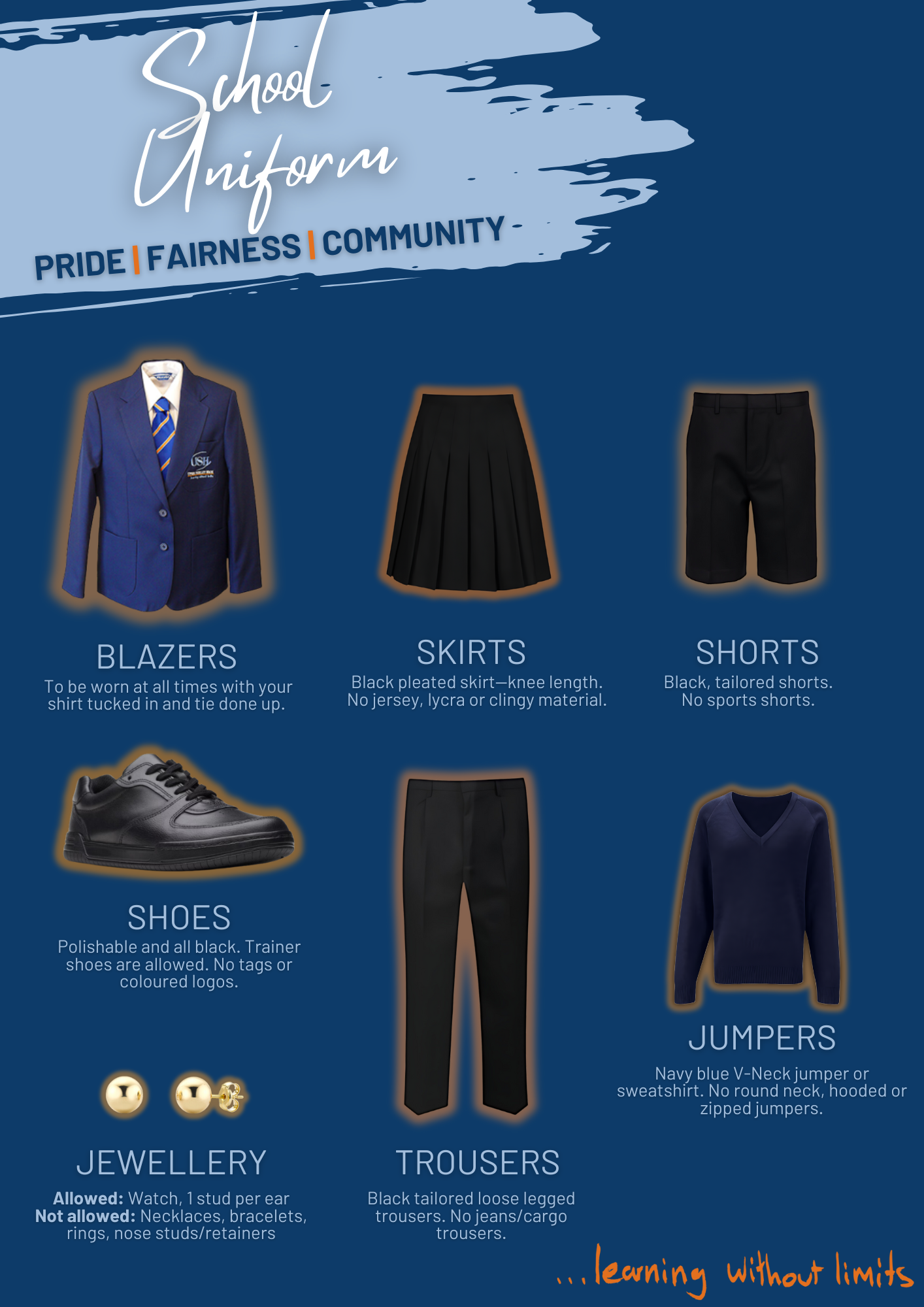 All students are expected to wear the correct uniform at all times, reflecting our high standards and our core values: Believe, Respect, Succeed.